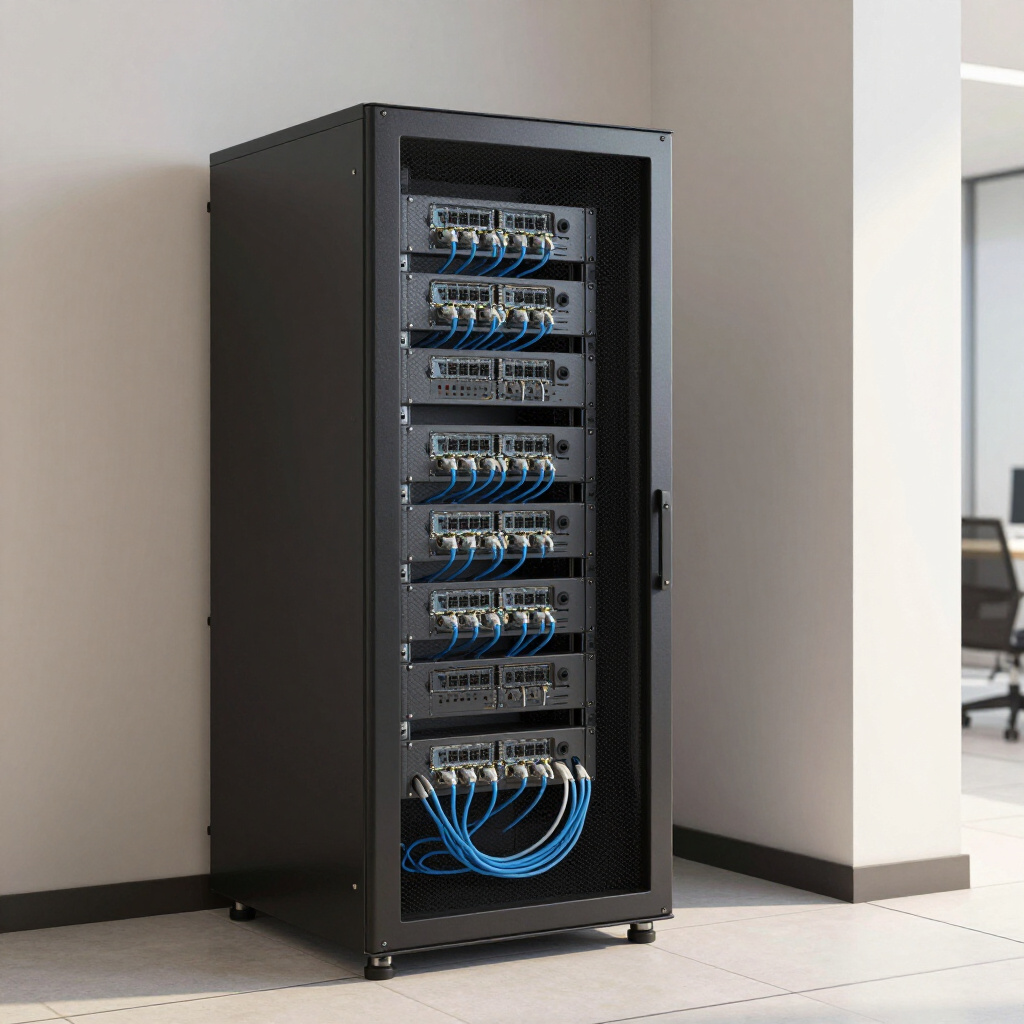 Montagem profissional seguindo normas técnicas rigorosas. Organização que facilita a manutenção e garante a refrigeração adequada dos seus ativos de rede.